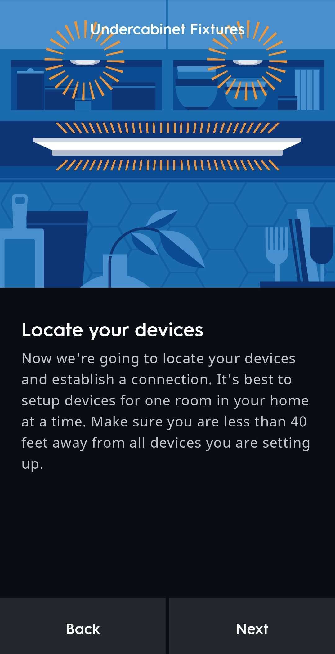 - On the next Locate your device screen when your Undercabinet Fixtures starts blinking, select Next. The Cync app will now locate your Undercabinet Fixtures. Be sure your device's location has a strong Wi-Fi signal strength during commissioning.