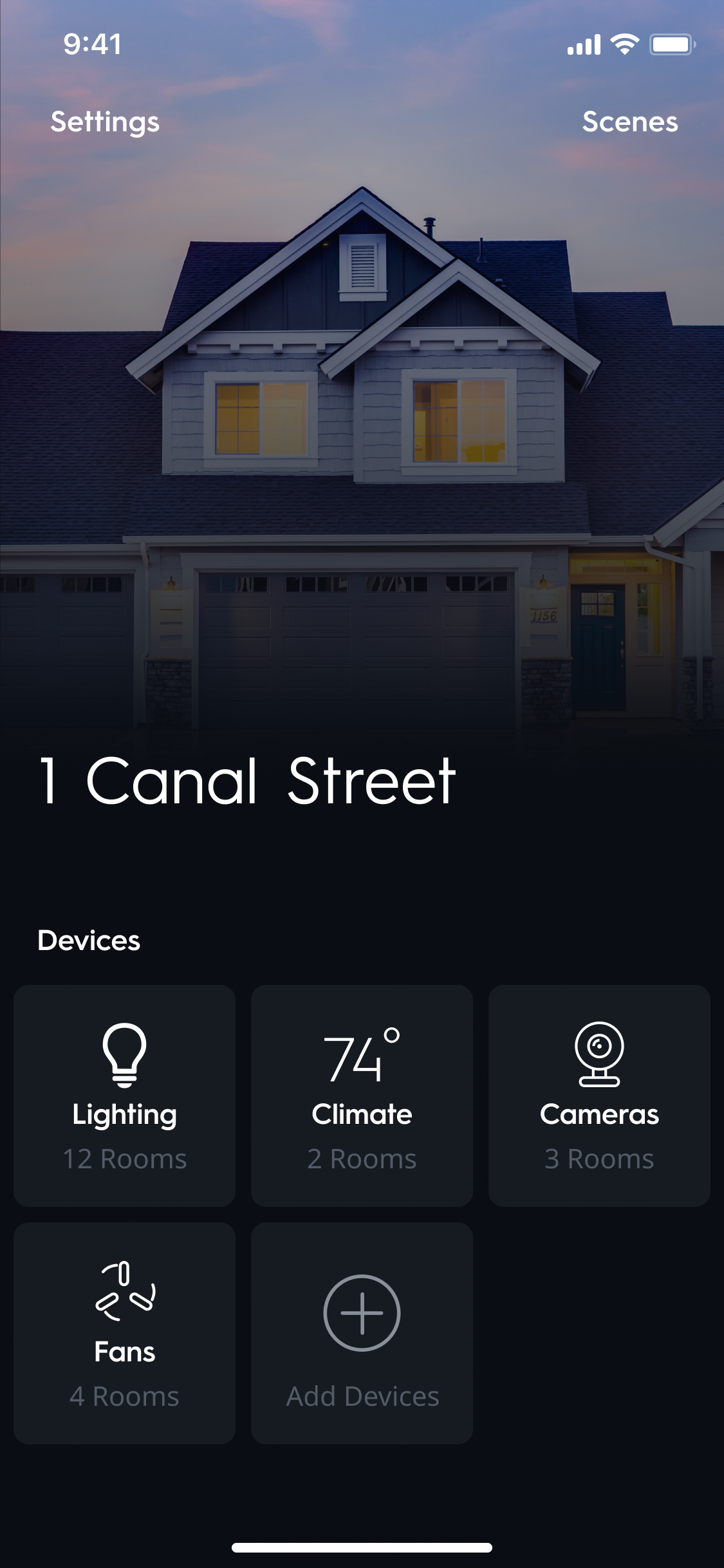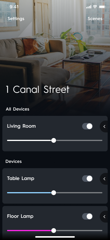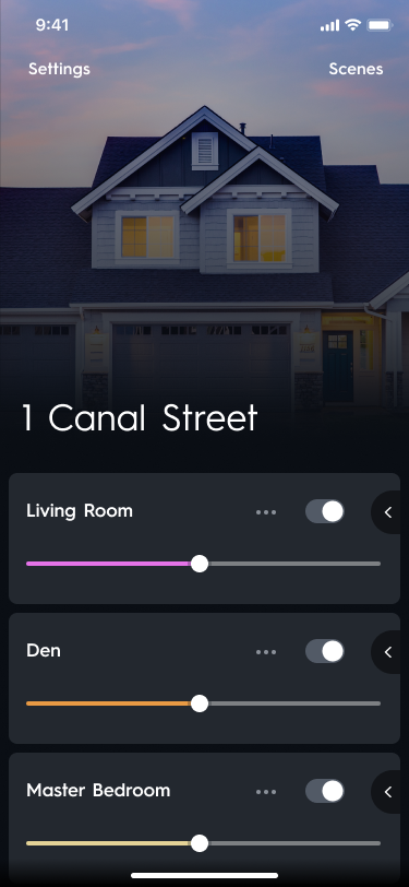 If you have more than one device type, like a lighting device and a camera, we will display a tiled homepage. To control individual devices, you will tap the device type you wish to control and navigate to the room or specific device to control it.