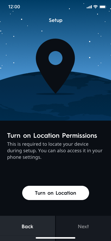 - Turn on Location Permissions if you have not already done so. This is required to locate your device during setup via Bluetooth. Select the Turn on Location button. A pop up screen will appear and ask for permission to use Location on your smart phone. Select Okay to enable and press Next.