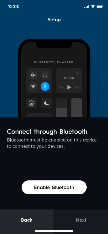 - Connect through Bluetooth. If you have not already done so, select the Enable Bluetooth button. A pop up screen will appear and ask for permission to use Bluetooth on your device. Select Okay to enable and press Next.