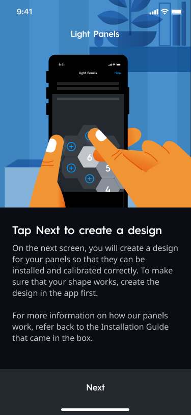 - On the next screen you will create a design for your panels so that they can be installed an calibrated correctly. To make sure that your shape works, create your design in the app first. For more information on how our panels are installed, refer to the Installing Smart Hexagon Panels article. Select Next on this screen to continue making your design in the Cync app.