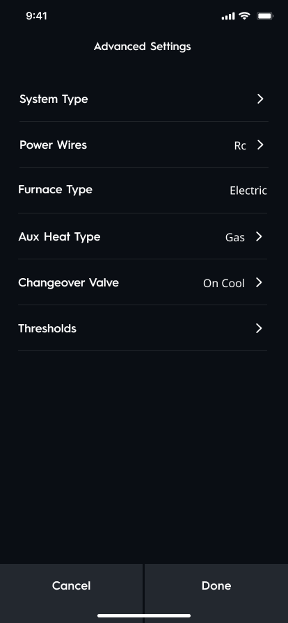 - Power Wires: Allows you to select the power wires currently connected to your thermostat. Selecting the incorrect power wires can damage or cause your equipment to function incorrectly.
