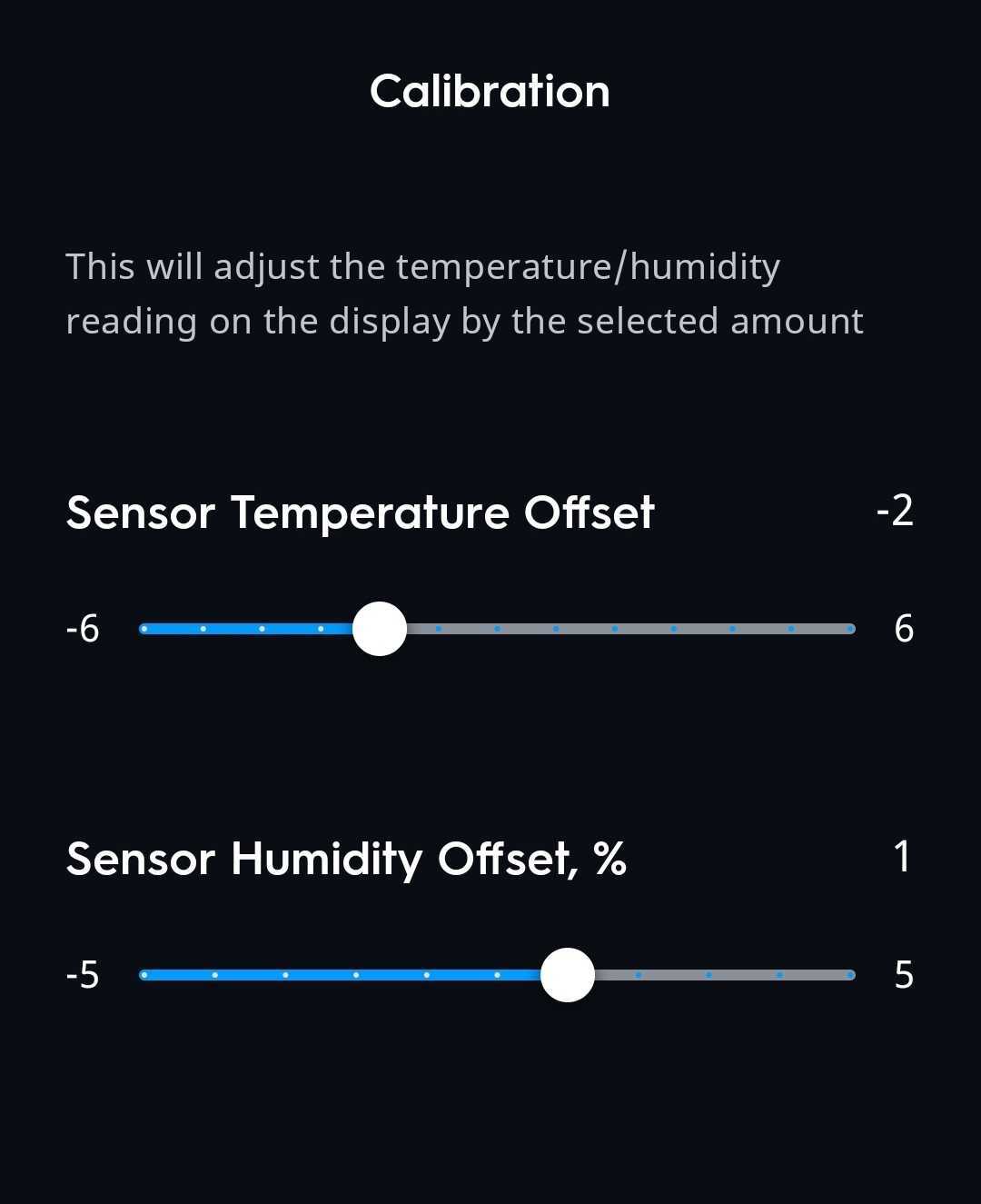 Adjust the temperature and humidity reading on the display by the selected amount, using the sliders.