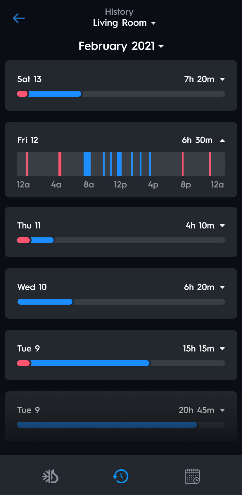 Access Thermostat History by selecting the history icon at the bottom of the Thermostat device page. This page displays the amount of time the home was being heated or cooled, with red representing heating and blue representing cooling.