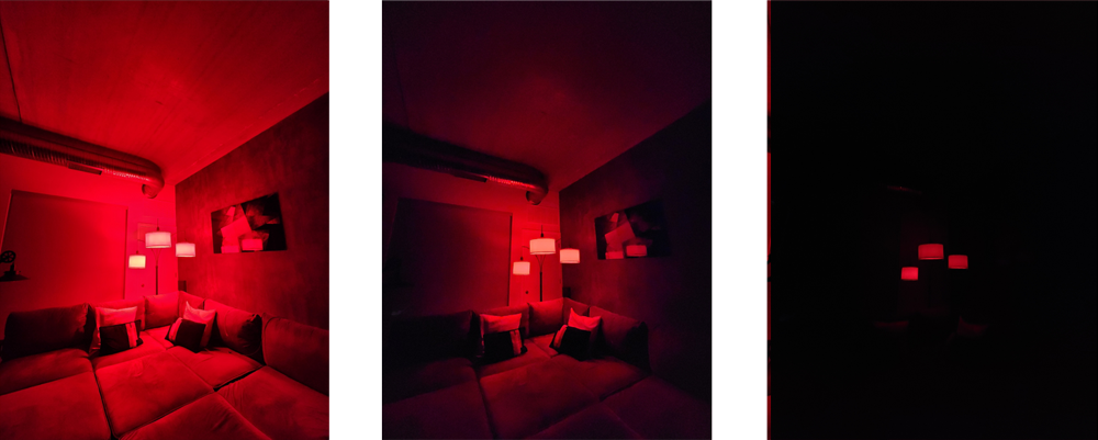 100% Brightness shown on the left. Old 1% dimming shown in the middle. New 1% dimming shown on the right.